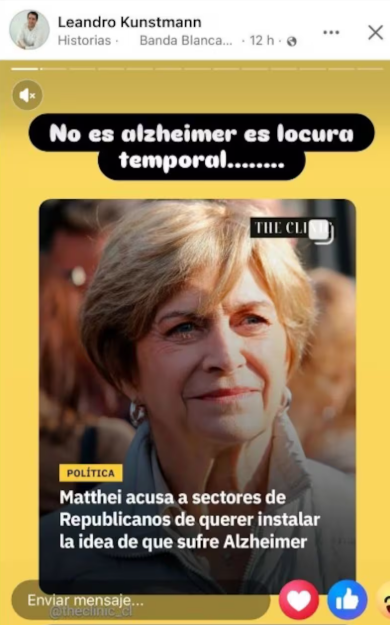 El ex concejal de Valdivia volvió a encender las alarmas dentro del bloque al postear en sus historias de Facebook una noticia con la denuncia de Matthei, acompañada de un ácido comentario: “No es alzheimer es locura temporal...”.