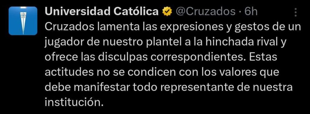 Fue por medio de sus redes sociales oficiales que la Universidad Católica rompió el silencio, compartiendo un escrito donde se disculpan públicamente por los hechos, pero lo curioso es que sin mencionar a Castillo: "Cruzados lamenta las expresiones y gestos de un jugador de nuestro plantel a la hinchada rival y ofrece las disculpas correspondientes".