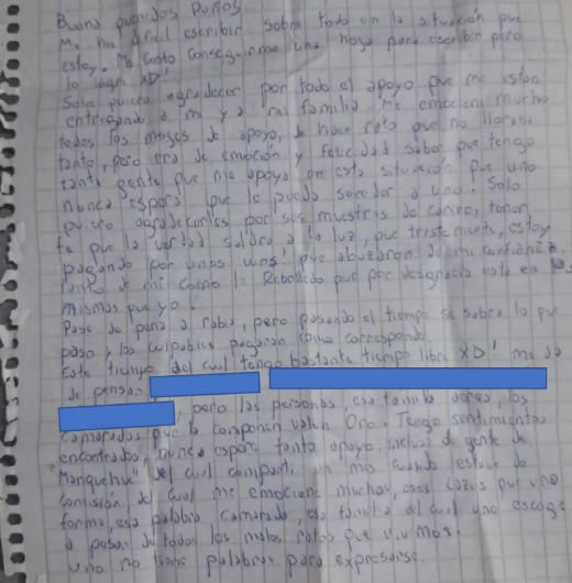 "Me ha sido difícil escribir, sobre todo en la situación en que estoy. Me costó conseguirme una hoja para escribir, pero lo logré XD", partió diciendo el ex funcionario en la carta escrita con lápiz pasta que fue revelada por Meganoticias.