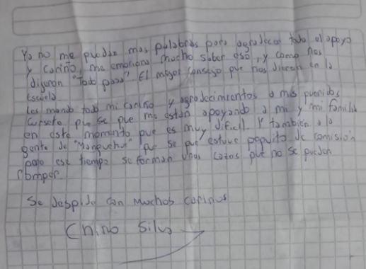 “Les mando todo mi cariño y agradecimiento a mis queridos cursete que sé que me están apoyando a mí y mi familia en este momento, pues es muy difícil. Y también a la gente de 'Manquehue' que sé que estuve poquito de comisión, pero en ese tiempo se forman unos lazos que no se pueden romper", sinceró. "Se despide con mucho cariño: Chino Silva", cerró.