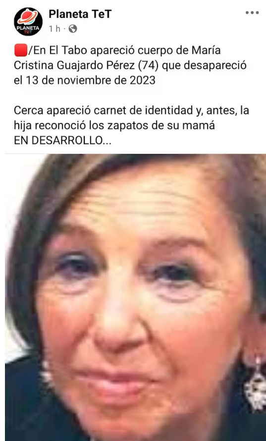 “En el Tabo apareció el cuerpo de María Cristina Guajardo Pérez, quien desapareció el 13 de noviembre de 2023″, se puede leer en la publicación que llamó a la confusión debido a la imagen adjunta.